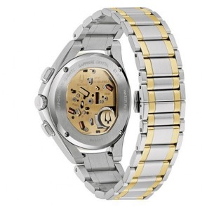 The dual mode is implemented by the 4 o’clock pusher. The watch is paired with a matching tapering silver and gold-tone stainless steel bracelet with a deployant clasp with pushers.